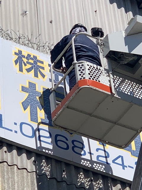 まるでプロの職人のような腕前。高所作業車での一日中の作業。